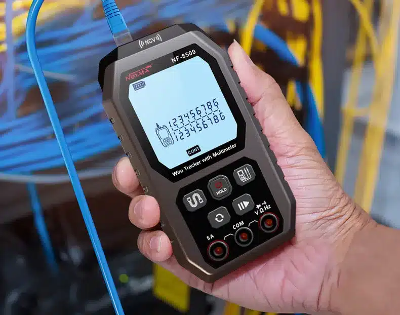 El Multímetro y Probador de Cables de red Noyafa NF-8509 combina rastreador de cables avanzado y multímetro digital en un solo equipo profesional. Permite localizar y seguir cables a través de paredes, techos y pisos con tecnología de rastreo digital anti-interferencias, además de verificar cables RJ45 (continuidad, longitud, PoE y port-flash). Incorpora detección de voltaje sin contacto (NCV), pantalla LCD retroiluminada y una interfaz intuitiva para mediciones precisas y rápidas.