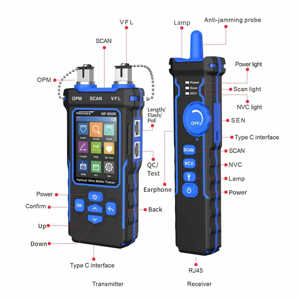 El Probador de cable de red y fibra óptica Noyafa NF-8508 integra en un solo equipo 9 funciones clave para diagnóstico profesional de redes cobre y fibra. Realiza mapeo de alambre, rastreo digital con anti-interferencia, parpadeo de puertos, medición de longitud, verificación PoE (IEEE 802.3af/at y no estándar), prueba de crimpado de un solo extremo, medidor de potencia óptica (OPM), localizador visual de fallas (VFL 10 mW) y detección de voltaje sin contacto (NCV). Su batería Li-ion de 1.500 mAh con carga USB-C garantiza jornadas de trabajo prolongadas en campo.